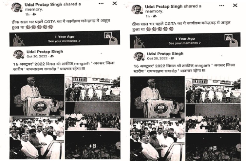 गुरुजी ने कार्यक्रम की फोटो पोस्ट किया है, जिसमें निर्वतमान स्वास्थ्य मंत्री टीएस सिंहदेव, विधायक गुलाब कमरो, डॉ विनय जायसवाल, मनेंद्रगढ़ सीट से कांग्रेस प्रत्याशी रमेश सिंह सहित अन्य राजनैतिक दल के पदाधिकारी-कार्यकर्ता नजर आ रहे हैं।