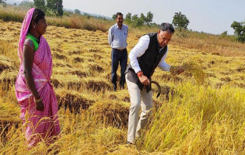बैकुंठपुर. Collector cut crops: नए जिले मनेंद्रगढ़-चिरमिरी-भरतपुर के कलक्टर पीएस धु्रव मंगलवार को खडग़वां ब्लॉक का दौरा करने निकले थे। इस दौरान उन्होंने रतनपुर से चोपन वाया चोटिया सडक़ निर्माण का निरीक्षण भी किया। इसी बीच उनकी नजर धान काट रहे किसानों पर पड़ी। यह देखते ही कलक्टर धु्रव (Collector PS Dhruv) किसान छोटेलाल और जहान साय के पास खेत में पहुंच गए। उन्होंने किसानों से धान कटाई-मिजाई व धान बिक्री को लेकर बातचीत की। फिर हंसिया लेकर उनके साथ धान की कटाई करने लगे।