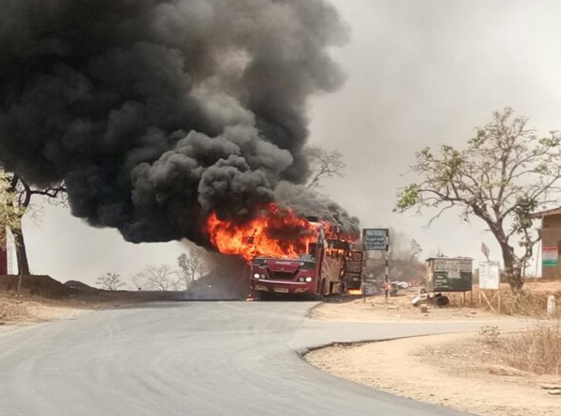 बैकुंठपुर/खडग़वां.दुर्ग से यात्रियों को लेकर भैयाथान आ रही रॉयल बस में रविवार की सुबह 11 बजे टायर ब्लास्ट होने के बाद भयंकर आग लग गई। देखते ही देखते बस पूरी तरह जलकर खाक हो गई। बस का केवल ढांचा ही मौके पर बचा। गनीमत रहीं कि आग लगने के दौरान करीब दर्जनभर यात्री सुरक्षित बस से उतर गए थे।