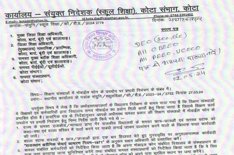स्कूलों में मोबाइल के उपयोग पर पाबंदी, कोटा संभाग में आदेश जारी