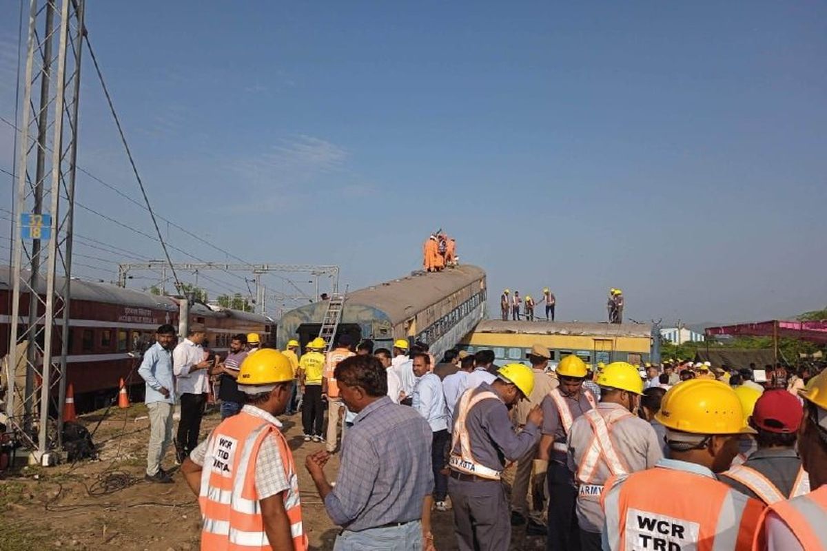 kota News : कोटा रेल मंडल के बूंदी रेलवे स्टेशन पर शनिवार को अचानक यात्री गाड़ी के दो पहिए बेपटरी हो गए। मामले की सूचना पर राष्ट्रीय आपदा प्रतिक्रिया बल बटालियन की टीम, रेलवे विभाग की टीम सक्रिय हो गई। मौका था रेल दुर्घटनाओं में आपातकालीन संयुक्त फुल स्केल मॉक ड्रिल अभ्यास का।