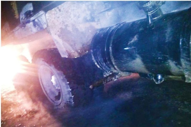 ट्रक में दौड़ा करंट , टायर फटे, कूदकर बचाई जान