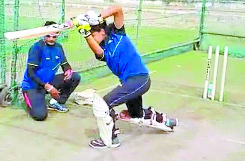 सांगोद में अपने घर पर क्रिकेट का अभ्यास करती आयुषी। (फाइल फोटो )