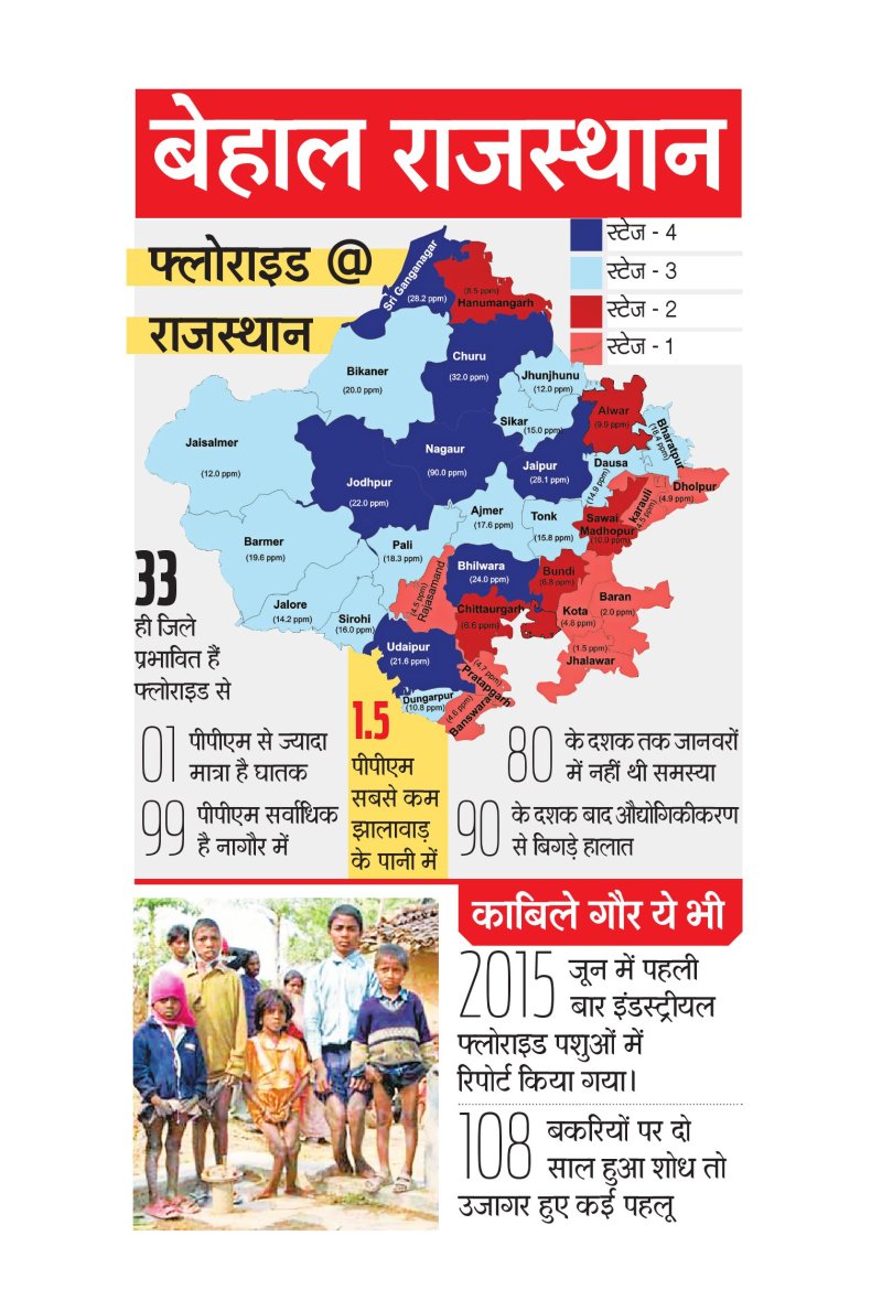 जानवर तक फ्लोरोसिस के शिकार हो रहे। जीव विज्ञानी डॉ. शांतिलाल चौबीसा बताते हैं कि देश में फ्लोराइड के सबसे घातक नतीजे राजस्थान में सामने आए हैं। पूरा प्रदेश हैवी फ्लोराइड की चपेट में है। सबसे कम मात्रा 1.5 पीपीएम झालावाड़ के पानी में, जबकि सर्वाधिक 99 पीपीएम नागौर में है।
