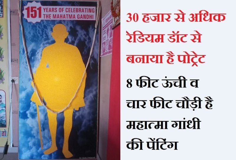 कोटा. महात्मा गांधी की 151 जयंती के उपलक्ष्य में डॉ. निधि प्रजापति द्वारा रेडियम डॉट्स से बनाई गई कृति ने गोल्डन बुक ऑफ वल्र्ड रिकॉर्ड बनाया है। यह पेंटिंग 8 फीट ऊंची व 4 फीट चौड़ी है।