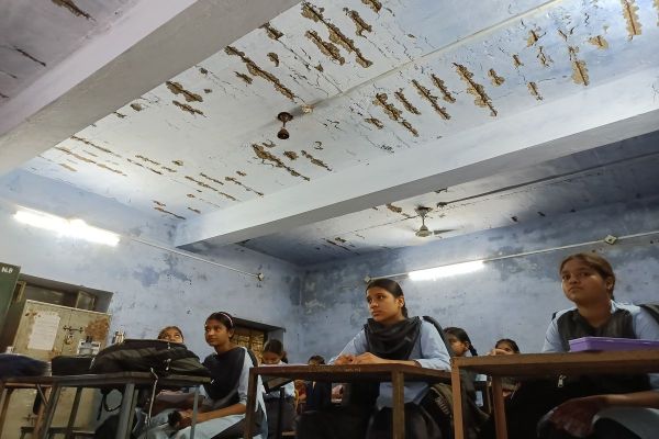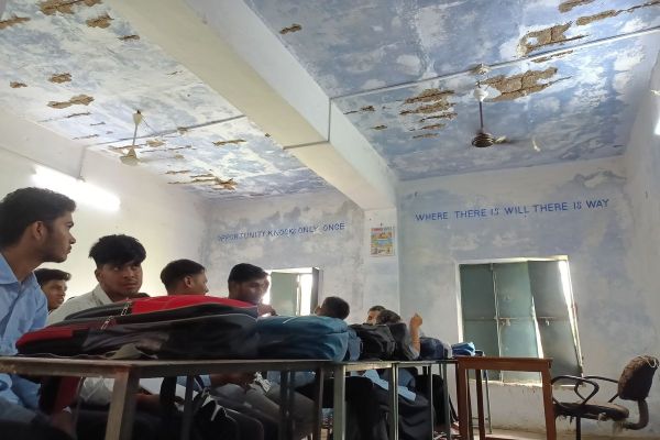 उखड़े प्लास्टर व क्षतिग्रस्त छत के तले अध्ययन को मजबूर विद्यार्थी।
