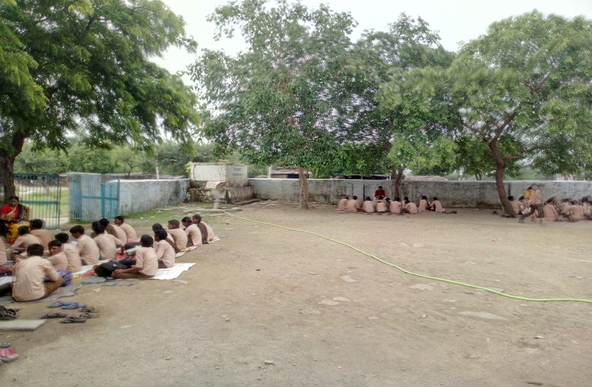 राजकीय उच्च माध्यमिक विद्यालय तम्बोलिया में पेड़ के नीचे पढ़ते बच्चे।