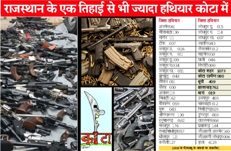 बीते वर्ष में कोटा शहर में ही 1073 हथियार मिले। यह कितनी बड़ी संख्या है, इसका अंदाजा इसी से लगाया जा सकता है कि यह संख्या राज्य के 10 जिलों में मिले हथियारों की संख्या से भी अधिक है। कोटा ग्रामीण राज्य का दूसरा ऐसा पुलिस जिला है, जहां कोटा शहर के बाद सबसे अधिक हथियार मिले।