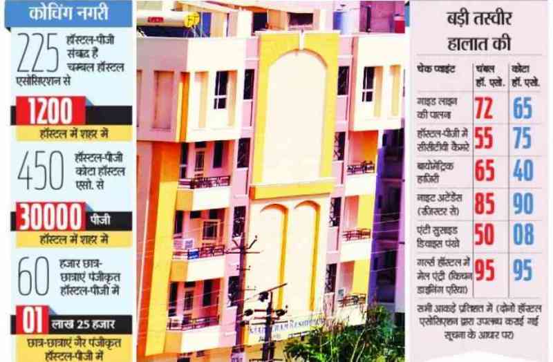 राजस्थान पत्रिका ने जनवरी 2018 में हॉस्टल और पीजी में रह रहे छात्रों की सुरक्षा व्यवस्था जांचने के लिए 'हालात-ए-हॉस्टल अभियान चलाया था। इस दौरान हॉस्टल एसोसिएशन के पदाधिकारी तक के हॉस्टल में बेसमेंट में किचिन चलता मिला था। इतना ही नहीं करीब 95 फीसदी हॉस्टलों में फायर फाइटिंग सिस्टम खराब पड़े थे। दिखाने के लिए सिलेंडर दीवारों पर तो टंगे थे, लेकिन उनकी डेट सालों पहले ही एक्सपायर हो चुकी थी। हॉस्टलों में कमरों का निर्माण इतने सघन तरीके से किया गया था कि आग लगने पर फायर ब्रिगेड भी अंदरूनी हिस्सों तक नहीं पहुंच पाए। अधिकांश हॉस्टल और पीजी बिना फायर एनओसी के ही चलते मिले थे। हद तो यह थी कि उनमें इमरजेंसी एग्जिट तक का बंदोबस्त नहीं था।