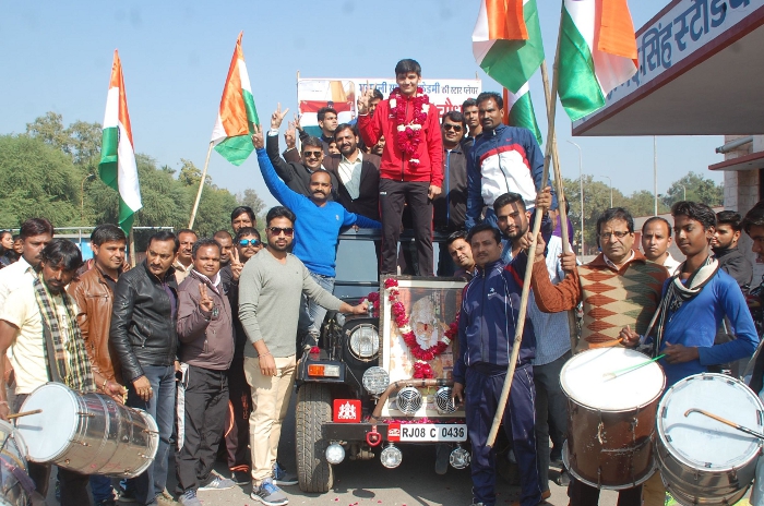 मार्ग में शहरवासियों ने चौधरी का माल्यार्पण किया। रामपुरा में छोटी समाध के उस्ताद बालकृष्ण भरतिया, श्रीपुरा में महाबली व्यायामशाला, कैथूनीपोल में कांग्रेस पदाधिकारियों, संस्थाओं के लोगों ने देश का नाम रोशन करने पर चौधरी को बधाई दी। इसके बाद न्यास कार्यालय में अध्यक्ष रामकुमार मेहता, गिरिराज गौतम, दीपक सुमन, जयनारायण गुर्जर व अधिकारिसयों ने साफा पहनाकर सम्मान किया।