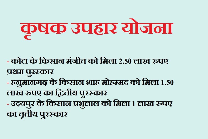 उन्होंने बताया कि कृषि विभाग ने किसानों के लिए कृषि उपज को ई-नाम के माध्यम से विक्रय करने तथा ई-पेमेंट के माध्यम से भुगतान प्राप्त करने के लिए प्रेरित करने व किसानों को अपनी उपज का अधिकाधिक लाभ दिलाने के उद्देश्य से कृषक उपहार योजना लाग की गई थी। योजना के तहत मंडी स्तर पर प्रत्येक 6 माह में प्रथम पुरस्कार 25 हजार, द्वितीय 15 हजार व तृतीय पुरस्कार 10 हजार रुपए दिया जाता है। वहीं खण्ड स्तर पर प्रत्येग 6 माह में प्रथम पुरस्कार 50 हजार, द्वितीय 30 हजार व तृतीय पुरस्कार 20 हजार रुपए दिए जाते है। इसके साथ ही वर्ष में एक बार राज्य स्तर पर पुरस्कार दिए जाते है।