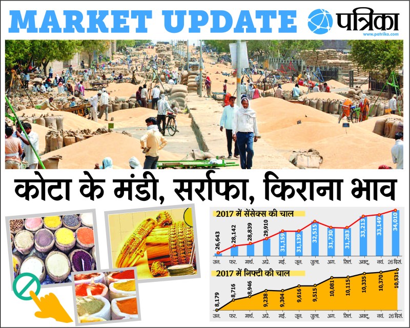 अनाज : गेहूं मिल क्वालिटी 1640 से 1670, गेहूं (147) 1700 से 1750, बेस्ट 1850 से 2000, लोïकवन 1650 से 1750, लोकवन बेस्ट 1850 से 2000, चंदौसी 3000 से 3100, ज्वार : पशु आहार 1150 से 1200, संकर बोल्ड 1250 से 1300, सफेद 1900 से 2000