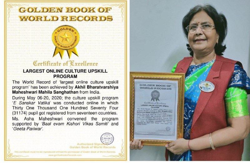 इस विशाल एवं अनूठे, ऑनलाइन आयोजन के लिए महिला संगठन का नाम गोल्डन बुक ऑफ वल्र्ड में शामिल किया गया है। राष्ट्रीय महामंत्री मंजू बांगड ने और कार्यालय मंत्री मधु ललिता बाहेती ने बताया कि गोल्डन बुक ऑफ वल्र्ड के एशिया हेड मनीष विश्नोई ने यह रिकॉर्ड राष्ट्रीय अध्यक्ष आशा माहेश्वरी को मेल पर भेजा है।