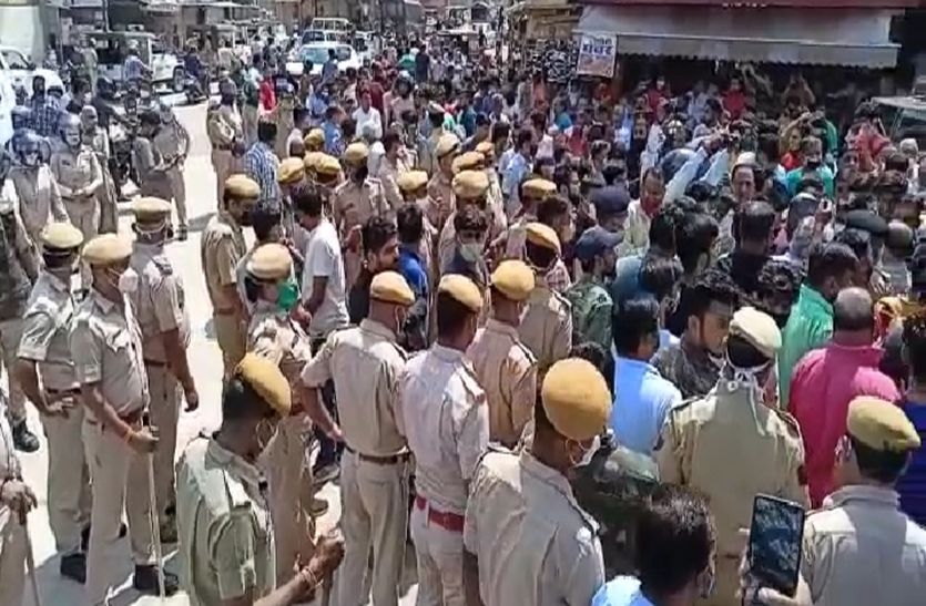 कोटा के गुमानपुरा स्थित इंदिरा गांधी सर्किल पर मृतक के परिजनों व सिंधी समाज के लगाया जाम।