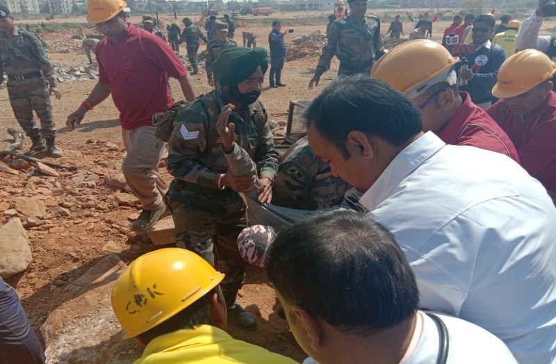 मलवे में दबे लोगों की तलाश के लिए एनडीआरएफ के प्रशिक्षित डॉग्स हाजिया और मौली की भी मदद ली गई। मलवे में दबे लोगों की गंध मिलते ही वह भौंकने लगीं और जवानों ने मलवा हटा घायलों को बाहर निकाला। तब तक वहां पहुंच चुकी एंबुलेंस और मेडिकल स्टाफ ने इलाज शुरू कर दिया। सेना ने आपातकालीन अस्पताल भी शुरू कर दिया। कोटा थर्मल में लगी आग को बुझाने के लिए एयर फायर बिग्रेड और आरएपीपी के न्यूक्लियर प्लांट में हुए रिसाव से लोगों को बचाने के लिए जवानों ने बचाव के तरीकों का प्रदर्शन किया।