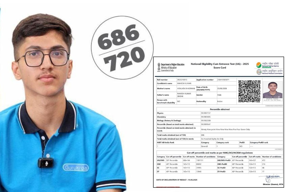 NEET 2025 Topper Mahesh Kumar: नीट 2025 के रिजल्ट घोषित हो गए हैं और एक बार फिर राजस्थान के स्टूडेंट्स ने कमाल कर दिया है। देशभर से राजस्थान के हनुमानगढ़ जिले से टॉपर बने महेश कुमार ने 99.99% लाकर AIR-1 हासिल की है। इस परीक्षा में देशभर से 22 लाख से ज्यादा छात्रों ने भाग लिया था, जिसमें से 12 लाख से ज्यादा स्टूडेंट्स ने सफलता हासिल की। वहीं टॉप 10 में 9 लड़कों और 1 लड़की ने अपनी जगह बनाई है।