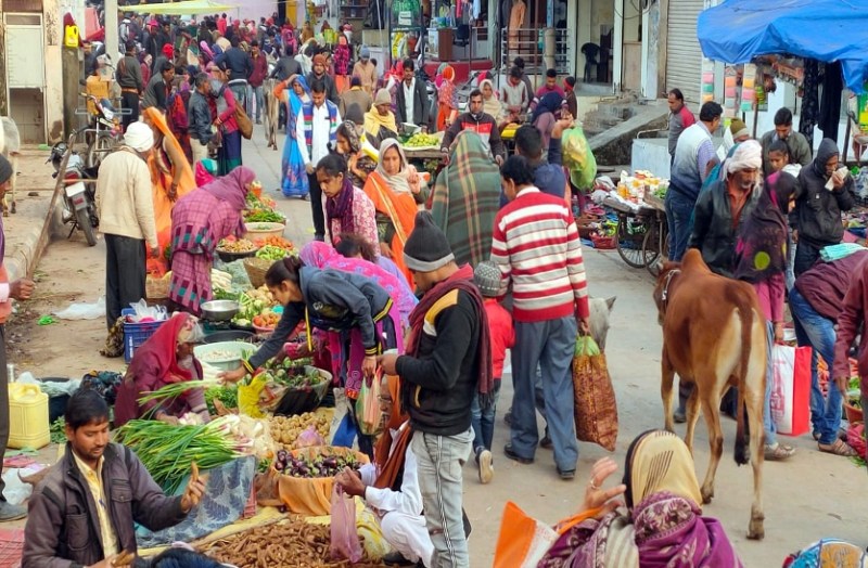 सरकार ने कोरोना संक्रमण के फैलाव को रोकने के लिए शादी-ब्याह एवं अन्य आयोजनों में लोगों की संख्या भले ही सीमित कर दी, लेकिन यहां सोमवार को साप्ताहिक हाट में सैकड़ों लोग भीड़ के रूप में खरीदारी करते नजर आए। यहां हाट में खरीदारी करने आए ज्यादातर लोगों के चेहरे से मास्क गायब दिखा। सोशल डिस्टेंस तो कहीं नजर नहीं आया। ग्राहकों के साथ ही सब्जी बेचने वाले भी गाइडलाइन की पालना से दूर नजर आए।