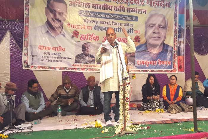 पीपल्दाकलां. कस्बे में पल के दहड़ेश्वर महादेव मंदिर परिसर में चल रहें 8 दिवसीय सोरती मेले में शनिवार रात को अखिल भारतीय कवि सम्मेलन कार्यक्रम आयोजित हुआ । कार्यक्रम में मुख्य अतिथि दीपक दाधीच व अध्यक्षता मंडी डायरेक्टर सिद्धार्थ नंदवाना , विशिष्ट अतिथि कोलाना मठ चतुर्भुज गिरी महाराज, चंद्रशेखर देशबंधु, रमेशचंद दाधीच, पूर्व सरपंच नारायणलाल अमरोलिया रहे।