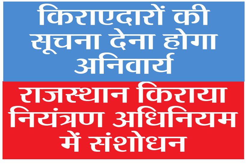 कोटा . अब कोई भी परिसर या मकान किराए पर देने से पहले मकान मालिक और किराएदारों को लिखित करार करना होगा। इसके बिना न परिसर किराए पर दिया जा सकेगा, न ही लिया जा सकेगा। इसके लिए निर्धारित प्रारूप में किराया प्राधिकारी को सूचना देना आवश्यक होगा। राजस्थान किराया नियंत्रण अधिनियम-2001 में अक्टूबर 2017 में संशोधन करके धारा 22 संयोजित की गई है।