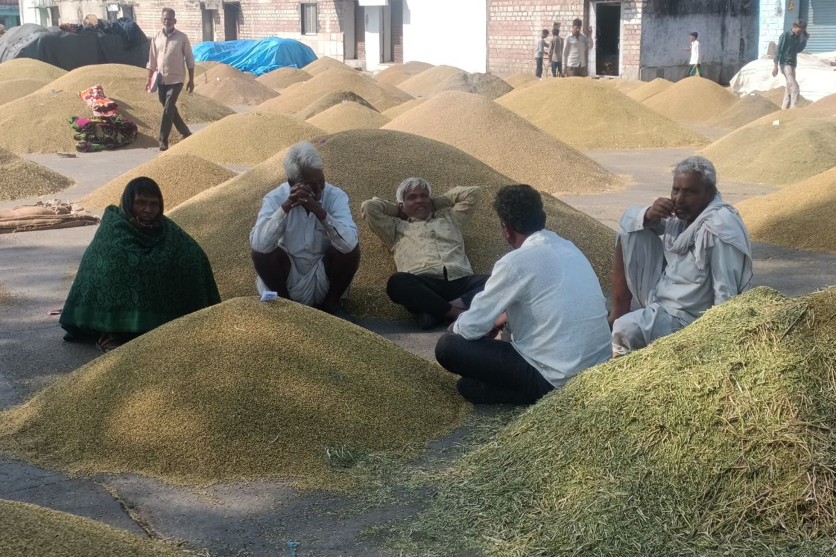 रामगंजमंडी. कृषि उपज मंडी में नीलामी से पहले आपस में फसल व भावों के बारे में चर्चा करते किसान।