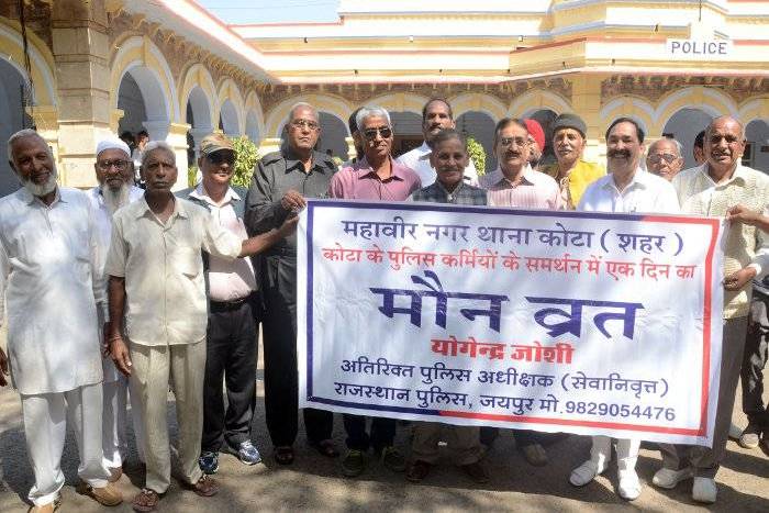 जयपुर निवासी रिटायर्ड एएसपी योगेन्द्र जोशी गुरुवार को पुलिस लाइन में मौन व्रत पर बैठने के अनुमति लेने सुबह 10.30 बजे एसपी कार्यालय पहुंचे। वे एसपी के आने का इंतजार कते रहे। करीब दो घंटे बाद एसपी सवाई सिंह गोदारा कार्यालय पहुंचे, लेकिन अनुमति नहीं दी। जोशी ने कहा, 'मैं अनुशासित तरीके से विरोध जताना चाहता था, मगर अनुमति नहीं मिलने मैं नाराज हूं।' जोशी के समर्थन में बूंदी से रिटायर्ड हैड कांस्टेबल राजेन्द्र त्रिपाठी, सेवानिवृत्त सीआई सुखदेवा राम, एएसआई हमीद, कांस्टेबल धन्नालाल मीणा, मदनपाल सिंह, जलालुद्दीन, निजामुद्दीन और बशीर मोहम्मद आदि लोग मौजूद रहे।