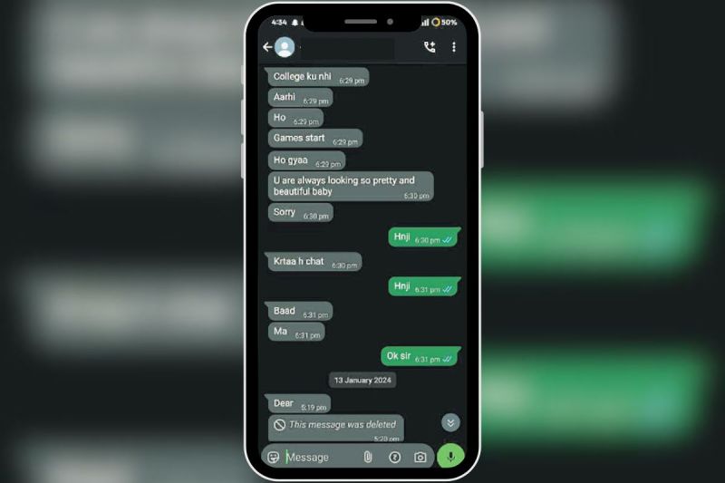 छात्राओं का आरोप है कि प्रिंसिपल ने कुछ गर्ल्स को अपने ग्रुप में ले रखा है। उनके जरिए दूसरी छात्राओं को फंसाने की कोशिश करते हैं। छात्राओं की ओर से शिकायत के साथ संलग्न किए गए स्क्रीनशॉट में ‘प्रीटी एंड ब्यूटीफुल बेबी’, आइ मिस यू और केन वी चेट इन नाइट… जैसे मैसेज लिखे हैं। छात्राओं ने आरोप लगाया कि किसी काम से प्रिंसिपल के चैंबर में जाती हैं तो वे गलत नजर से देखते हैं और उन पर कमेंट करते हैं। देर रात बात करने के लिए मजबूर करते हैं।