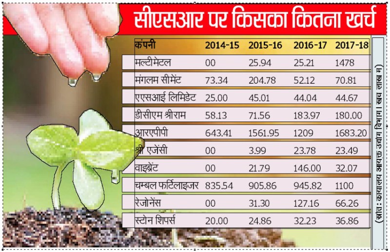 कंपनी एक्ट में संशोधन के बाद कोटा में सिर्फ 10 कंपनियों ने माना कि वह सीएसआर के दायरे में आती हैं। हाल ही में विधानसभा के दूसरे सत्र में विधायक संदीप शर्मा ने जब सीएसआर फंड से खर्च का ब्यौरा मांगा तो उद्योग विभाग के संयुक्त निदेशक उद्योग संजीव सक्सेना जानकारी दी कि इन दस कंपनियों ने 2014-15 से लेकर 2017-18 तक सामाजिक उत्थान के लिए 10,394.07 लाख रुपए खर्च किए।