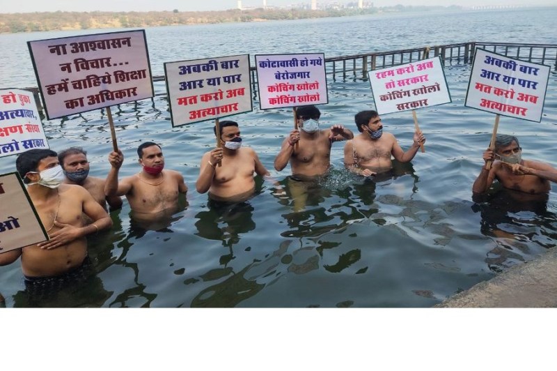 पहले से ही बेरोजगारी का हाल दिनों दिन बढ़ता जा रहा है। सबसे पहले समिति के सदस्यों ने भीतरिया कुण्ड में सूर्यदेव को नमस्कार करने के बाद हाथों में कोटा बचाओ की तख्तियां लेते हुए एक-एक करके पानी में उतरे और कमर तक के पानी में खड़े रहे।