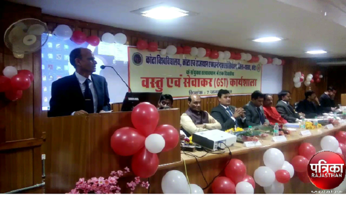 कोटा विश्वविद्यालय और राजस्थान एकाउन्टेन्ट्स एसोसिएशन की ओर से रविवार को विश्वविद्यालय सभागार में जीएसटी की बारीकियां समझाने के लिए कार्यशाला का आयोजन किया गया। इसमें सीजीएसटी उपायुक्त नरेश बुन्देल ने कहा कि देश में करों का बंटवारा स्पष्ट करने के लिए सेंट्रल गुड्स एंड सर्विसेज टैक्स (सीजीएसटी) और स्टेट गुड्स एंड सर्विसेज टैक्स (एसजीएसटी) प्रारूप के मॉडल को अपनाया गया है। इसका क्रियान्वयन और नीति निर्धारण जीएसटी काउन्सिल में होता है। जहां राज्यों एवं केन्द्र को बराबर प्रतिनिधित्व दिया गया है। 5 प्रकार के कर स्लेब हैं, जो कि 0, 5, 12, 18, 28 फीसदी की दर से प्रभावी हैं।