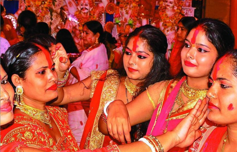 ढोल नगाड़े व विशेष ध्वनि के बीच देवी का पूजन कर फल फूल व नैवेद्य अर्पित किए। इसके बाद सिंदूर दान करने का सिलसिला शुरू हुआ। महिलाओं ने एक-दूसरे को सिंदूर लगाया। इस दौरान होली जैसी रंगत नजर आई। महिलाओं ने सिंदूर दान कर एक-दूसरे के लिए सुख समृद्धि की कामना की। यथा उम्र तथा सम्मान करते हुए उन्होंने एक दूसरों के चरण स्पर्श कर आशीर्वाद भी लिया।