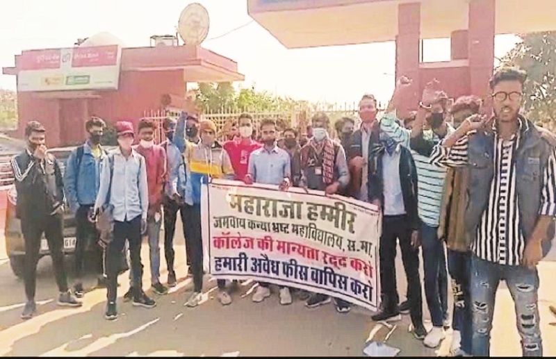 कोटा. कोटा विश्वविद्यालय, कोटा से मान्यता प्राप्त महाराजा हम्मीर कॉलेज और जमवाय कन्या महाविद्यालय के विद्यार्थियों ने बुधवार को कोटा विश्वविद्यालय में डेढ़ घंटे तक विरोध प्रदर्शन किया। छात्रों ने कुलपति प्रो. नीलिमा सिंह को ज्ञापन देकर कॉलेज की मान्यता रद्द करने की मांग की। सवाई माधोपुर में स्थित दो कॉलेजों के खिलाफ करीब एक माह से प्रदर्शन चल रहा है।