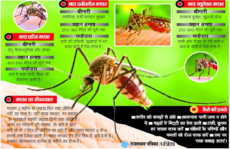 एनॉफ्लीज, एडीज व क्यूलेक्स तीनों ही मादा मच्छर हैं जो बीमारियां फैलाते हंै। मादा एडीज साफ पानी में पनपता है। यह दिन में काटता है। इनके शरीर में चीते जैसी धारियां होती है। मच्छर के लिए अनुकूल तापमान 18 से 32 डिग्री व आद्र्रता 60-80 प्रतिशत होना चाहिए। एक व्यस्क मच्छर 2-3 सप्ताह तक जीवित रहता है। एडीज मच्छर घरों में अंधेरे कोनों, परदे के पीछे, कपड़ों पर टेबल के नीचे छुपा रहता है।