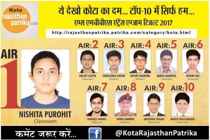 रिजल्ट में कोटा का परचम लहराया। कोटा ने वो कर दिखाया जो पहले कभी नहीं हुआ। पहली बार एक से लेकर दसवीं रैंक तक कोटा कोचिंग का दबदबा रहा। कोटा कोचिंग संस्थानों ने एम्स एग्जाम में बेहतरीन रिजल्ट देकर कोटा की धाक जमा दी है।