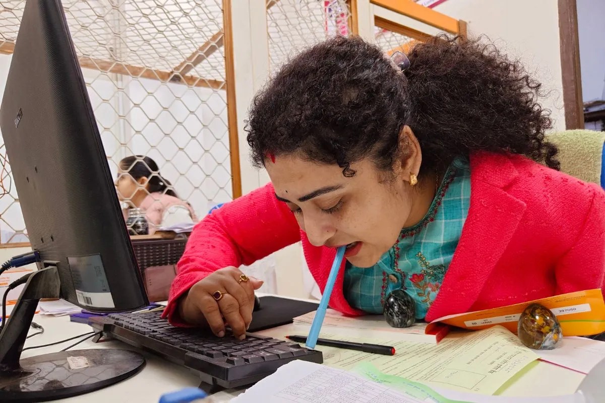 सोनल बैंक में कम्प्यूटर पर दूसरों कार्मिकों की रफ्तार से ही काम कर लेती है। इसके लिए एक हाथ में कम्प्यूटर का माउस रहता है और मुंह में पेन रखकर की-बोर्ड के बटन दबते हैं और हाथ से माउस चलता है। धीरे-धीरे अब ऐसी आदत हो गई कि दूसरे कार्मिकों की तरह आउटपुट देती है।