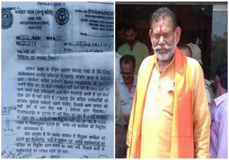 इस मामले में श्रम रोजगार राज्य मंत्री मनोहर लाल मन्नू कोरी ने 31 मई 2018 को चिकित्सा एवं स्वास्थ्य मंत्री को एक पत्र लिखकर जनपद भ्रमण के दौरान अवगत कराया गया है कि जिला चिकित्सालय जनपद ललितपुर में सपा शासनकाल से ठेकेदार द्वारा कार्यरत संविदा कर्मचारी सपा मानसिकता के होने के कारण ठीक ढंग से कार्य नहीं संपादित करते तथा यहां पर काम करने वाले संविदा कर्मी आए दिन नेतागिरी करते रहते हैं एवं कार्य ठीक ढंग से नहीं करते। अत: ऐसे संविदा कर्मचारियों को हटाकर सुयोग्य कर्मचारी रखना चाहिए, जिससे आम जनता को सही ढंग से लाभ मिल सके। ठेकेदार द्वारा पीएफ, पीएसआई का भुगतान भी नहीं किया जा रहा। नई व्यवस्था के तहत नए कर्मचारियों की नियुक्ति नहीं की जा रही है। इसीलिए इस संबंध में नियमानुसार सुयोग्य एवं कर्मठ नए कर्मचारियों की नियुक्ति की आवश्यकता है। अत: अनुरोध है कि सपा सरकार में नियुक्त कर्मचारियों को हटाते हुए बीजेपी पार्टी के सुयोग्य एवं कर्मठ कार्यकर्ताओं को संविदा पर नियुक्ति प्रदान करने का कष्ट करें, जिससे पार्टी के कार्यकर्ताओं का मनोबल लाया जा सके ।