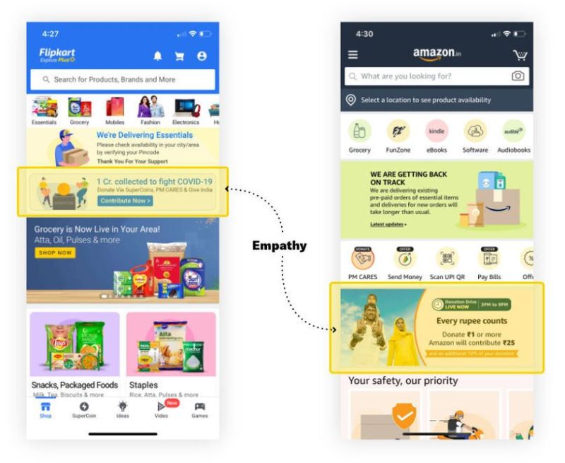 मोबाइल ऐप्स का विश्लेषण कर हम एशिया में कोविड-19 महामारी का एक खाका प्रस्तुत करती हैं। मोबााइल पर ऊपर से नीचे की ओर खबर पढ़ी जाती है और इसमें स्क्रीन भी छोटी होती है। मोबाइल में हम दांए से बांए नहीं जाते, वहीं उपयोगकर्ता मोबाइल पर टच करके उसे चलाता है, इसलिए बहुत सारे ऐप के निचले भाग में नेविगेशन होता है न कि शीर्ष पर क्योंकि यह स्विच करने और प्रयोग के लिहाज से भी आसान है। भारत की दो प्रमुख होम डिलीवरी ऐप में प्रतिद्वंद्वी होने के बावजूद जबरदस्त समानताएं हैं। दोनों में ही नेविगेशन सबसे नीचे है और शीर्ष पर उत्पादों के साथ शुरू में प्राथमिकता के साथ कंपनियों ने अपने ऐप पर मिलने वाले उत्पाद उसकेबाद सेवाओं के बारे में और फिर पुन: फीडबैक के रूप में उत्पादों का जिक्र किया हुआ है। कोरोना ने बहुत सी चीजें बदलकर रख दी हैं। इसलिए अपने ग्राहकों को उत्पाद और सेवा के अलावा दो अन्य बातों पर भी निर्णय लेना था।