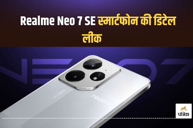 Realme Neo 7 SE: रियलमी नियो 7 ईएसई स्मार्टफोन लॉन्च से पहले ही काफी चर्चा में है। यह फोन कंपनी की पॉपुलर सीरीज का नया एडिशन होगा, जिसमें अफोर्डेबल प्राइस पर दमदार फीचर्स मिलने की उम्मीद है। हालांकि, लॉन्च से पहले इसके स्पेसिफिकेशंस की पूरी डिटेल लीक हो चुकी है। कंपनी ने पहले ही पुष्टि की है कि इस अपकमिंग फोन में Dimensity 8400-Max चिपसेट मिलेगा। फोन के रियर में 50MP का मेन कैमरा और 8MP का सेकंडरी लेंस दिया जाएगा।