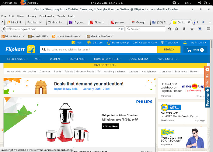 ई-कॉमर्स वेबसाइट फ्लिपकार्ट ने 2 दिन की रिपब्लिक डे सेल का आगाज किया है, जिसमें स्मार्टफोन से लेकर कपड़े और दूसरे इलेक्ट्रॉनिक सामानों में छूट दी जा रही है।