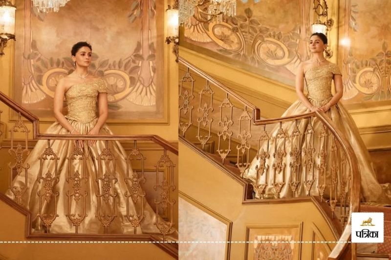आलिया का गोल्डन गाउन लुक एक फैशन मास्टरपीस की तरह है। यह कस्टम डिजाइन आलिया के लिए प्रसिद्ध डिजाइनर्स अबू जानी और संदीप खोसला द्वारा तैयार किया गया है। गाउन की शिमरिंग वन-शोल्डर सिल्हूट, हाथ से किए गए काम, जरी कढ़ाई और नाजुक सीक्विन मोटिफ्स इसे एक परफेक्ट Masterpiece बनाते हैं। इसके नीचे की अल्ट्रा-फ्लेयर सिल्क स्कर्ट ने लुक को नाटकीय रूप दिया है, और आलिया को एक मॉडर्न-डे बेल (Belle) जैसा बना दिया है, जो हर किसी को मंत्रमुग्ध कर देने वाला है।