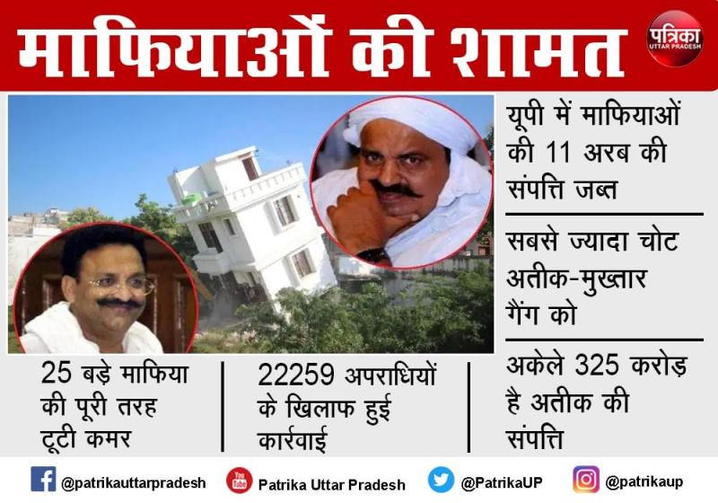 लखनऊ. उत्तर प्रदेश की योगी सरकार सूबे में माफिया की कमर तोड़ने में जुटी है। बीते 15 महीनों में उत्तर प्रदेश में 22 हजार से ज्यादा अपराधियों पर कार्रवाई कर 11 अरब से अधिक की सम्पत्ति जब्त की है। बाहुबली मुख्तार अंसारी और अतीक अहमद गैंग की पूरी तरह से कमर तोड़ दी गई है। स्टेट लेवल के 25 कुख्यात माफिया अपराधियों को चिन्हित कर उनके गैंग के सदस्यों व चल-अचल सम्पत्तियां जब्त की जा रही हैं। अतीक-मुख्तार के अलावा सुंदर भाटी और ध्रुव कुमार उर्फ कुंटू सिंह जैसे माफिया और उनके गैंग बर्बाद कर दिया गया है।