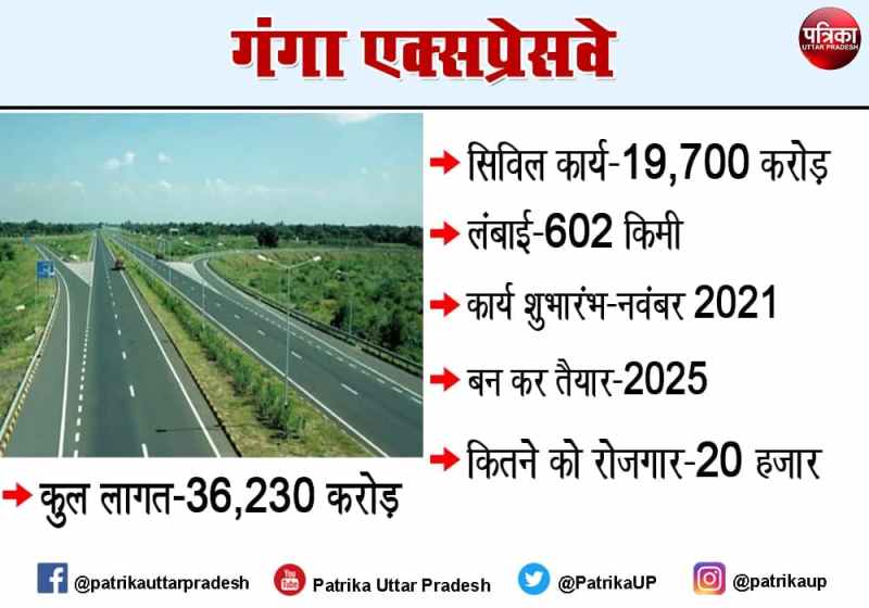 लखनऊ. (पत्रिका न्यूज नेटवर्क). यूपी में देश का सबसे बड़ा गंगा एक्सप्रेसवे (ganga expressway) बन रहा है। गंगा एक्सप्रेसवे 602 किलोमीटर लंबा होगा। गंगा एक्सप्रेसवे वाराणसी के रास्ते मेरठ और प्रयागराज (Meerut to Prayagraj Ganga expressway) के बीच कई जिलों से होकर गुजरेगा। गंगा एक्सप्रेसवे पर नवंबर 2021 से काम शुरू हो जाएगा और 2025 तक यह बनकर तैयार हो जाएगा। गंगा एक्सप्रेसवे परियोजना की कुल लागत 36,230 करोड़ रुपए आंकी गई है। जिसमें 19,700 करोड़ रुपए सिविल कार्यों पर खर्च होंगे। गंगा एक्सप्रेसवे के लिए अब 92.20 फीसदी जमीन का अधिग्रहण हो चुका है। सिक्स लेन के गंगा एक्सप्रेसवे पर एयर स्ट्रिप भी बनेगी। एक्सप्रेसवे के रास्ते में पडऩे वाली गंगा नदी पर एक किलोमीटर का पुल और रामगंगा पर 720 मीटर का पुल बनेगा। इसके लिए अदानी रोड ट्रांसपोर्ट, अशोका बिल्डकॉन, वेल्सपन इंटरप्राइजेज और इरकान इंटरनेशनल जैसी कंपनियां अपनी बिड डाल चुकी हैं।