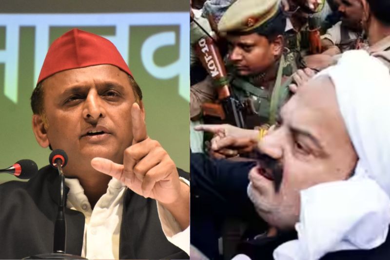 सपा प्रमुख अखिलेश यादव लाल टोपी में, पुलिसकर्मियों के साथ अतीक अहमद