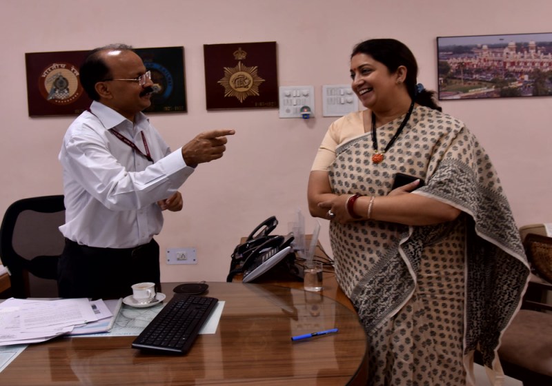 लखनऊ , अमेठी से बीजेपी सांसद और केन्द्रीय मंत्री स्मृति ईरानी राजधानी पहुँची। स्मृति ईरानी तकरीबन 12.30 बजे डीआरएम ऑफिस पहुँची। यहां पर डीआरएम संजय त्रिपाठी सहित तमाम अधिकारियों के साथ अमेठी के विकास कार्यो को लेकर चर्चा की। रायबरेली - अमेठी के बीच 60.1 किलोमीटर के रेलवे ट्रैक की डबलिंग कार्य को लेकर स्मृति ईरानी ने अधिकारियों के साथ चर्चा की।