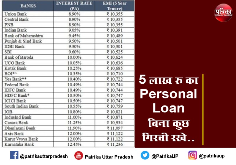 अगर सिविल अच्छा है। सैलरी ठीक है। तो आपको 5लाख तक का पर्सनल लोन तुरंत मिल सकता है। पत्रिका ने 25 बैंकों की एक लिस्ट तैयार की है. 5 साल का समय चुकाने के लिए और 5 लाख रुपये के पर्सनल लोन पर अलग अलग बैंक के द्वारा दी जा रही ब्याज के हिसाब से जोड़ा गया है।