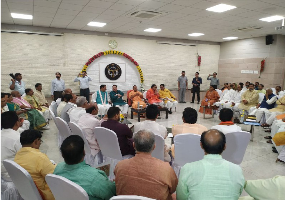 भोज से पहले मुख्यमंत्री योगी आदित्यनाथ ने पांच कालिदास मार्ग स्थित मुख्यमंत्री आवास पर सांसदों की बैठक बुलाई। मिली जानकारी के मुताबिक, इस बैठक में सांसदों के अभिनंदन के अलावा उपचुनाव की रणनीति पर भी चर्चा हुई। बैठक में भाजपा के प्रदेश अध्यक्ष महेंद्रनाथ पांडेय, संगठन महामंत्री सुनील बंसल, प्रदेश प्रभारी जेपी नड्डा, सह-प्रभारी गोवर्धन भाई झड़पिया, नरोत्तम मिश्रा, दुष्यंत गौतम, स्मृति ईरानी, संजीव बालियान, हरीश द्विवेदी, रवि किशन, रमापति राम त्रिपाठी, कौशल किशोर आदि मौजूद रहे।