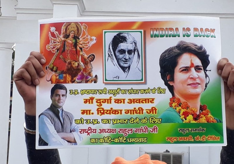 राहुल गांधी समर्थक राहुल अवस्थी और केडी दीक्षित की तरफ से लगाए गए इन पोस्टर में प्रियंका गांधी को दुर्गा का अवतार बताया गया है। पूर्व प्रधानमंत्री इंदिरा गांधी की तस्वीर इस पोस्टर में दिखाई दे रही है। पोस्टर में साथ ही लिखा गया है कि उत्तर प्रदेश में भ्रष्टाचारी रूपी असुरों का संहार करने के लिए प्रियंका गांधी के रूप में मां दुर्गा का अवतार हुआ है। उन्हें यूपी में प्रभार देने के लिए राष्ट्रीय अध्यक्ष राहुल गांधी को धन्यवाद। वहीं कांग्रेस के गढ़ रायबरेली व अमेठी में भी प्रियंका गांधी को पार्टी में कमान दिए जाने पर कार्यकर्ताओं ने जमकर जश्न मनाया। इसके लिए उन्होंने राहुल गांधी को बधाई भी दी।