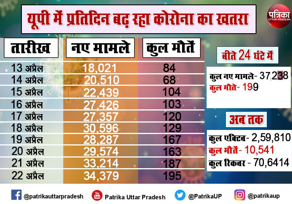 कोरोना से प्रतिदिन मौतों का आंकड़ा भी बढ़ा है, लेकिन इस बीच राहत की बात यह है कि संक्रमण को मात देने वालों का भी ग्राफ बढ़ा है। बुधवार को 14,198, तो गुरुवार को 16,514 लोग स्वस्थ हुए, शुक्रवार को 22,566 लोग डिस्चार्ज हुए हैं, इनमें लखनऊ के 7,165 लोग शामिल हैं। राजधानी लखनऊ में शुक्रवार को 5,682 नए कोरोना केस सामने आए हैं। 24 घंटे में प्रदेश में कुल 2,25,236 टेस्ट हुए थे।