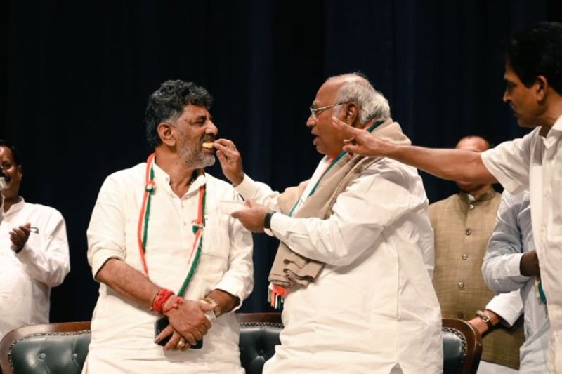 कर्नाटक कांग्रेस अध्यक्ष को मिठाई खिलाते पार्टी के राष्ट्रीय अध्यक्ष मल्लिकार्जुन खड़गे।