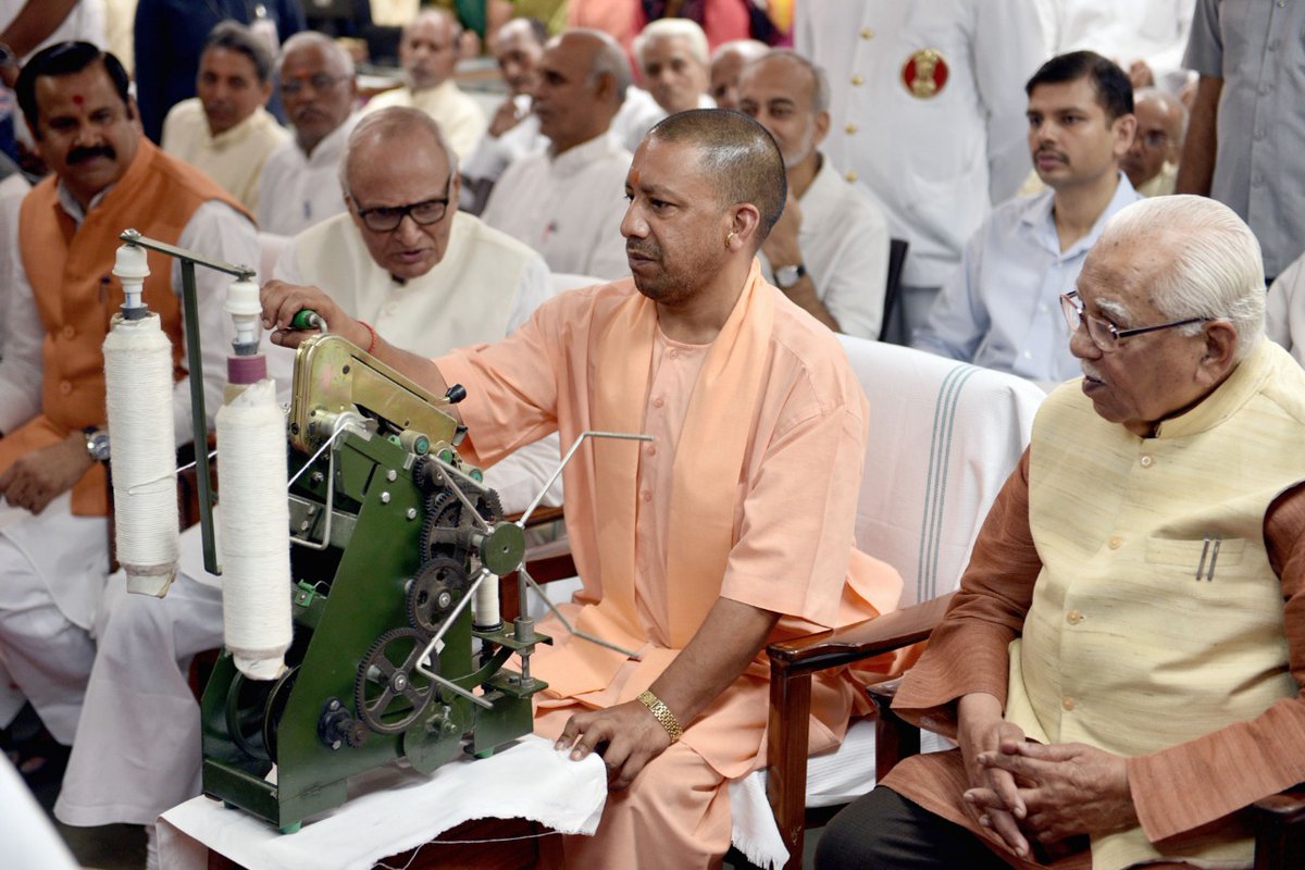सीएम योगी ने चलाया चरखा, 'रामधुन' गाकर दिया अहिंसा का संदेश