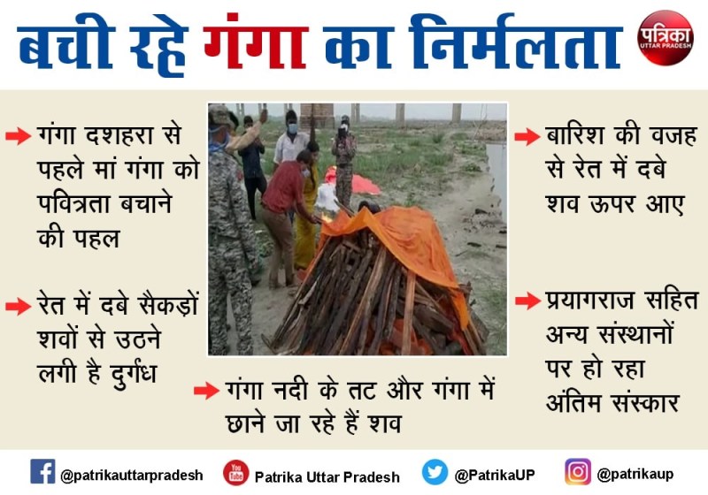 गंगा नदी में जगह-जगह रेत में शव दफनाए गए थे। महीनें पुराने शवों अब दुर्गंध उठ रही है, उनसे संक्रमण का भी डर बना हुआ है। कोरोना काल में गंगा किनारे बड़ी संख्या में दफनाए गए शवों से बारिश के मौसम में प्रदूषण का खतरा बढऩे का अंदेशा है। अंतिम संस्कार की पर्याप्त व्यवस्था न होने से प्रयागराज के फाफामऊ, छतनाग जैसे घाटों पर सैकड़ों शवों को रेत में दफना दिया गया था। लेकिन अब बारिश के बाद फाफामऊ घाट पर रेत से शवों के मिलने का सिलसिला जारी है। कहा जा रहा है कि यह सभी शव कोरोना संक्रमितों के हैं, जिन्हें जलाने की बजाए रेत में ही दबा दिया गया था। गंगा का जलस्तर बढऩे पर शव उतरा कर बह सकते हैं और इससे दशाश्वमेध, रामघाट से लेकर संगम और इससे आगे की धारा में भी गंगाजल प्रदूषित होगा।